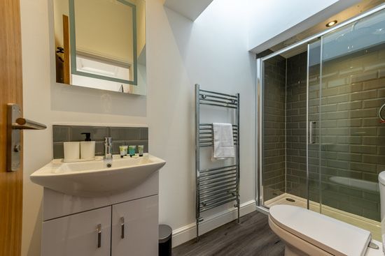 The bedroom is a generous size and features a lovely king-sized bed, complimented with bed side tables and lamps. You should find a good amount of storage here with a wardrobe, perfect for those longer stays.