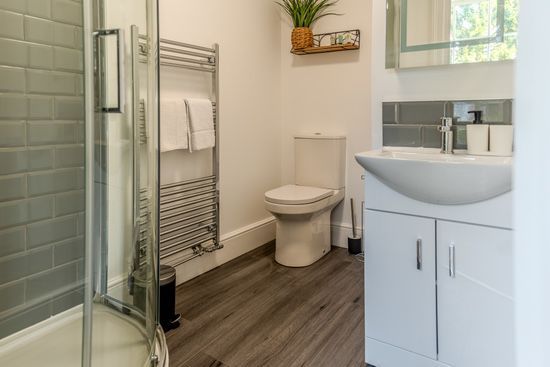 The bedroom features a lovely super king-sized bed. There is the option to have this set up as two singles, please do let us know ahead of time so that we can prepare the room for your stay. There is plenty of storage space with a wardrobe and shelves.