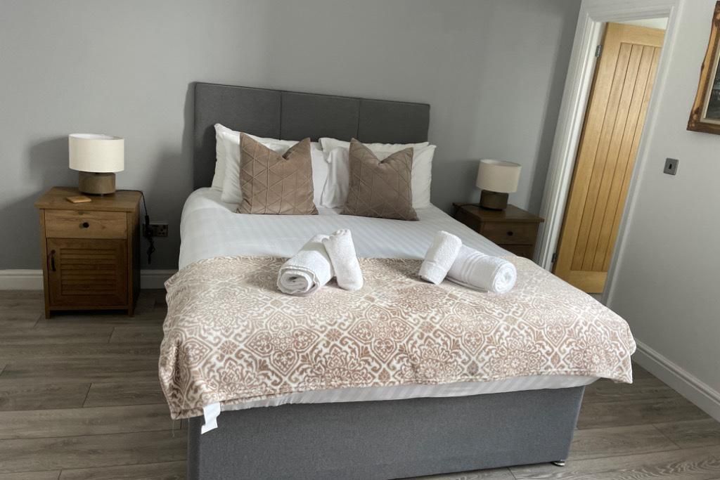 The bedroom features a lovely king-sized bed, complimented with bed side tables and lamps.